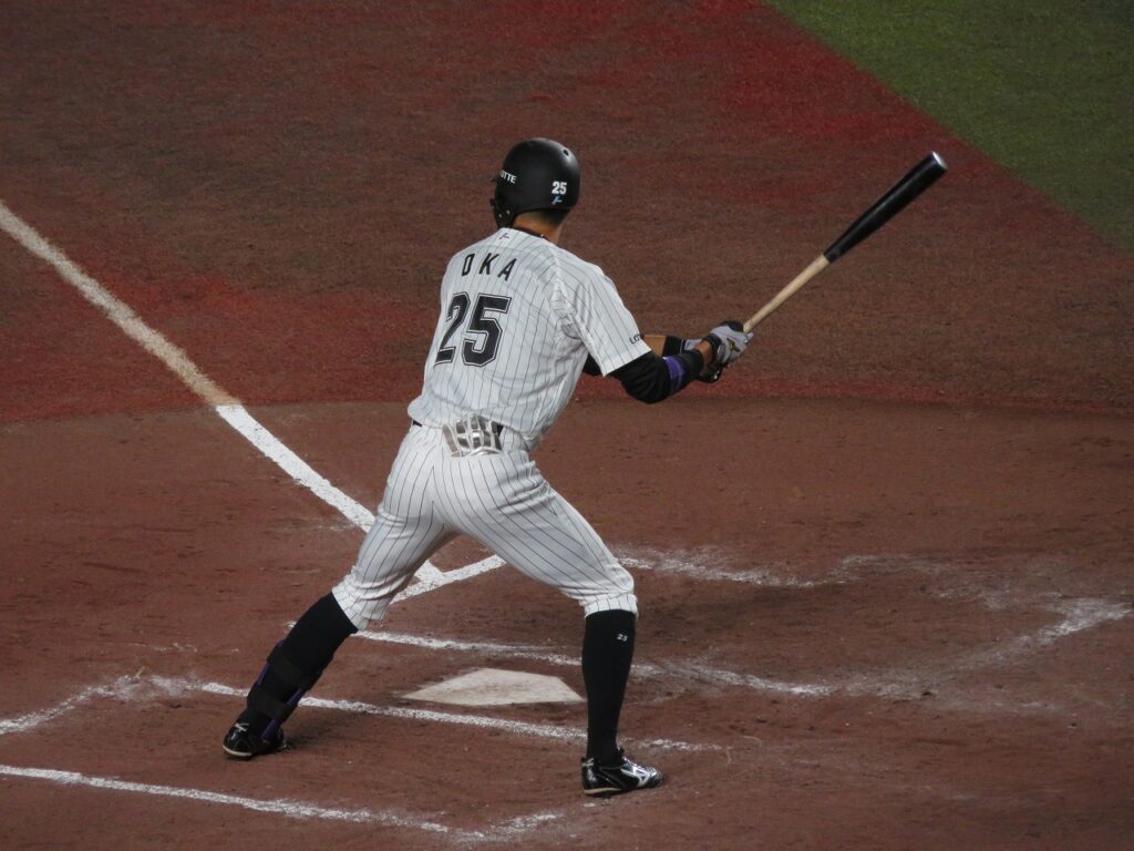 初球から積極的に打って行く岡選手です。2安打2打点と大活躍です。