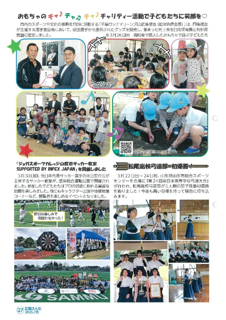 広報さんむ2025年7月号に掲載 / 選手激励会 / By admin / 2025年7月5日 令和6年12月5日に開催しました千葉ロッテマリーンズ山武後援会2025年選手激励会において、チャリティーオークション(入札)を行い、千葉ロッテマリーンズの選手からお宝グッズが提供されました。 チャリティーオークション(入札)の収益は全額、保育園等へ寄付させて頂き、その様子が広報さんむ2025年7月号(第232号)に掲載されました。