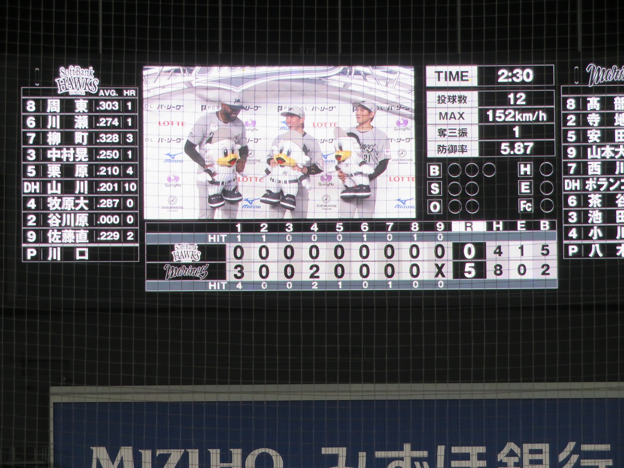 試合結果は、初回、寺地選手のソロホームランなどで幸先良く3点を先制します。そのまま迎えた4回には、ポランコ選手のソロホームランと藤原選手のスリーベースヒットで2点を追加し、試合を優位に進めました。投げては、石川投手が6回3安打無失点の好投で今季3勝目を挙げ、5対0でマリーンズが勝利しました。