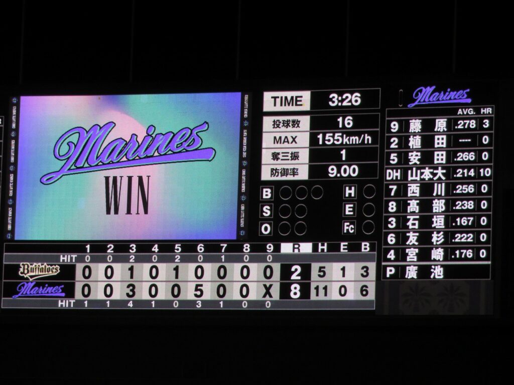 試合の結果は、1点を先制された直後の3回に、山本選手と上田選手のタイムリーヒットなどで3点を挙げ、逆転に成功しました。3-2となって迎えた6回には、安田選手のタイムリーツーベースヒットと西川選手のタイムリースリーベースヒットで一挙5点を奪い、相手を突き放しました。投げては、先発の小島投手が6回2失点の好投で今季4勝目を挙げ、8対2でマリーンズが勝利しました。