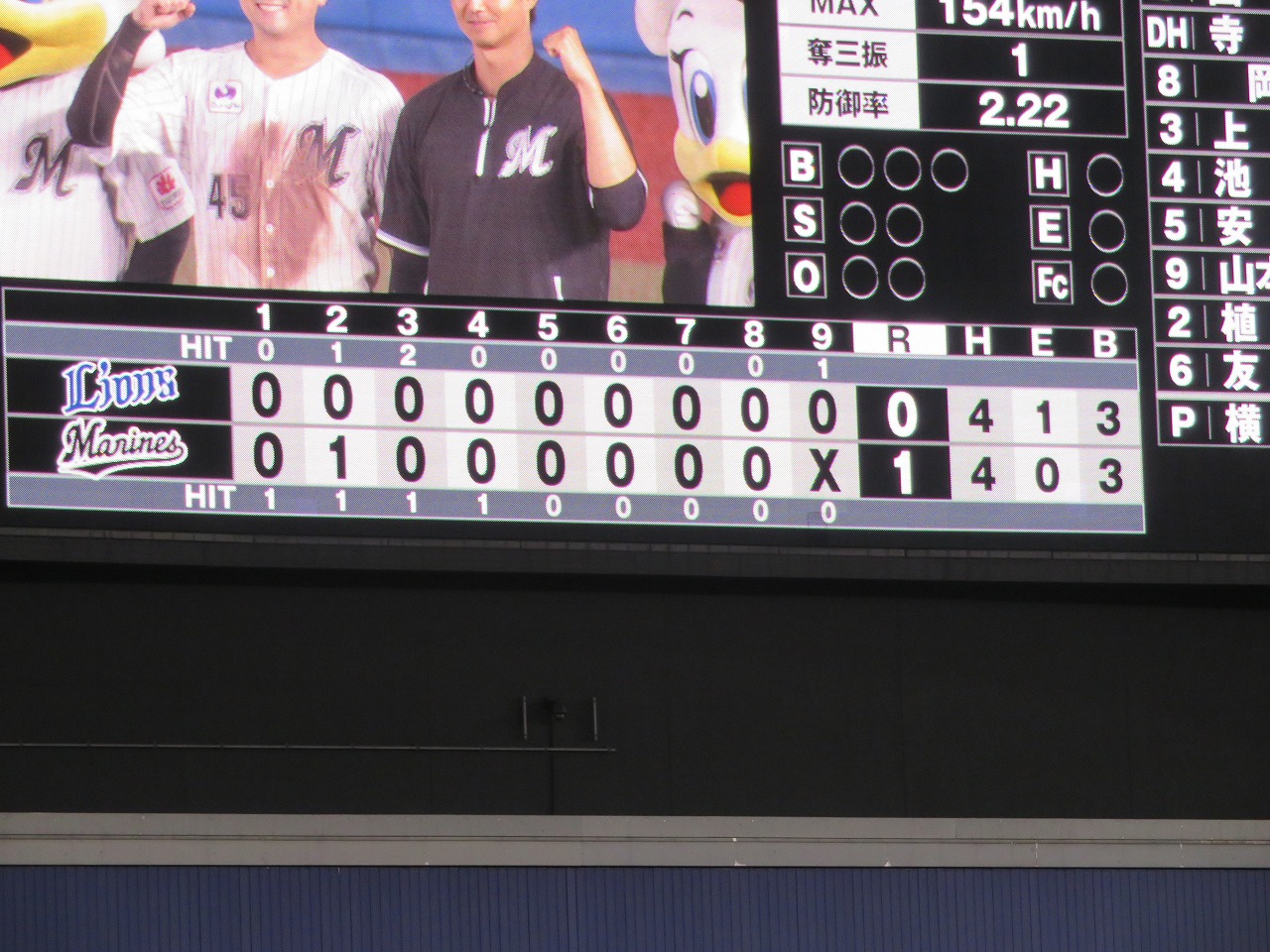 試合の結果は、マリーンズが接戦を制しました。2回、ノーアウト1,3塁から山本選手が犠牲フライを放ち、先制に成功します。投げては、先発唐川投手が7回3安打無失点の好投し、その後は廣池投手、横山投手のリレーで1点を守り抜き、1対0でマリーンズが勝利しました。唐川投手は今季初勝利を挙げました。