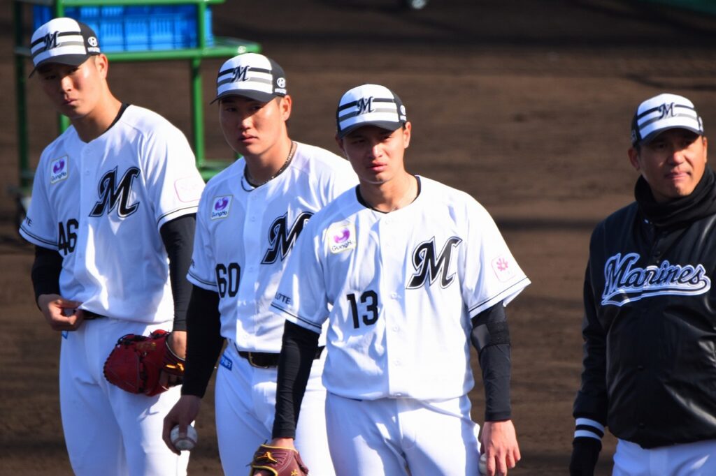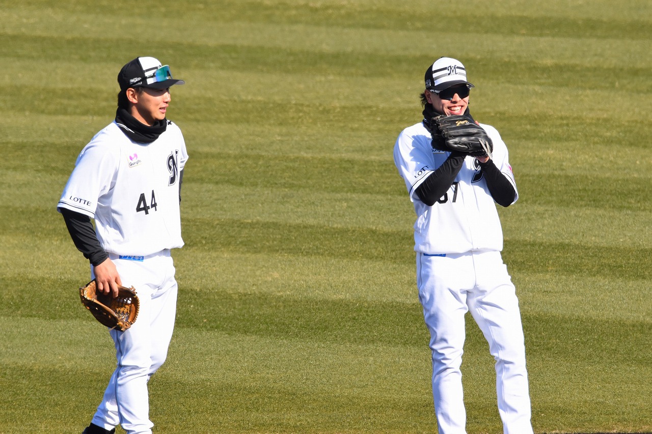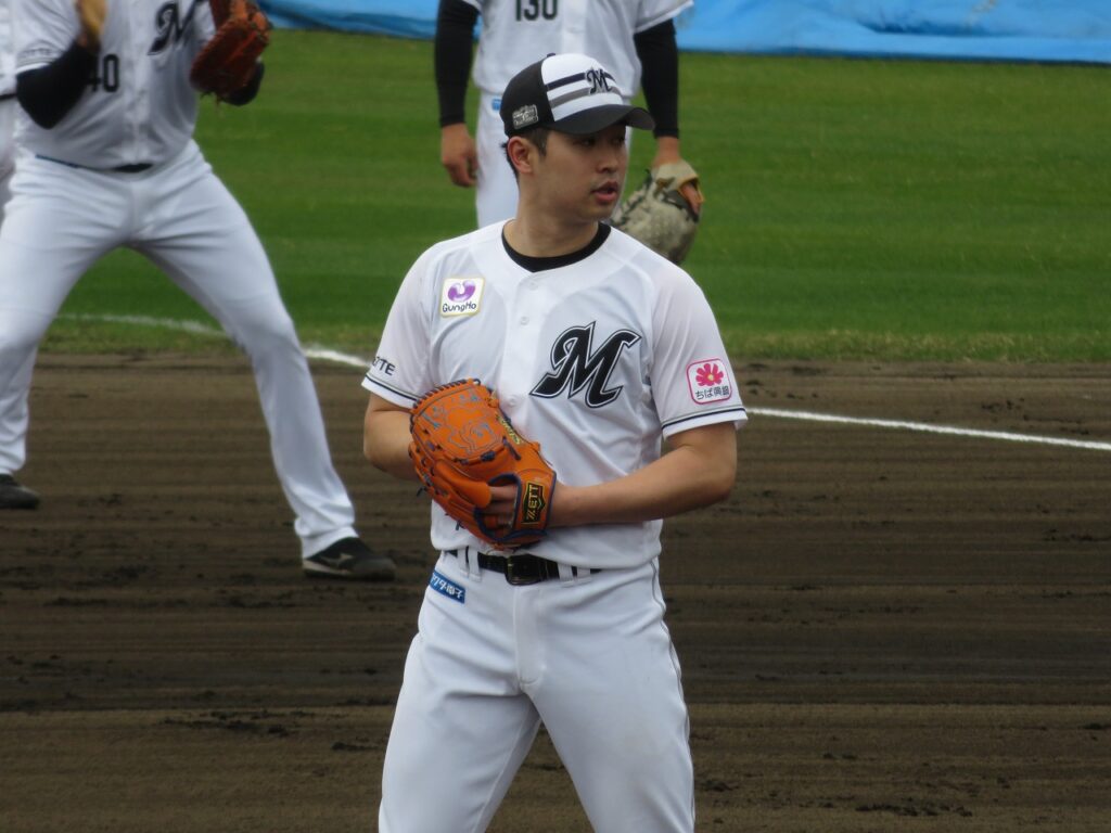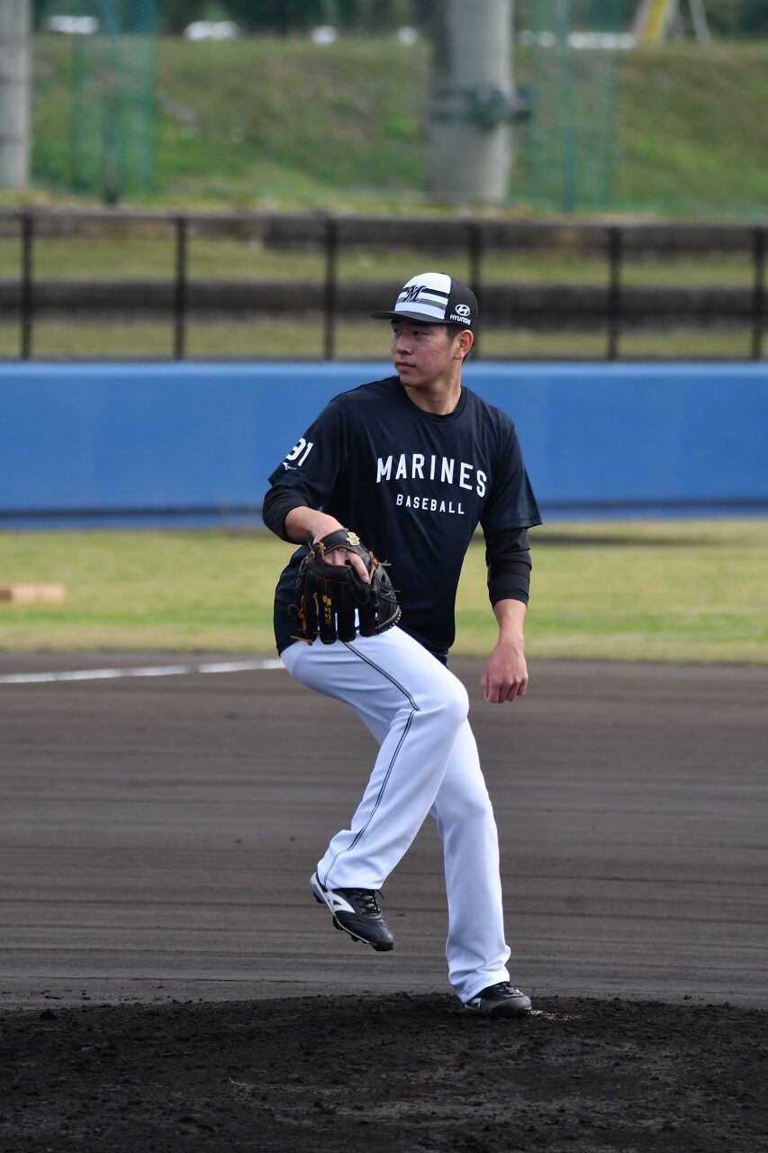 WBC日本代表メンバーに選出された種市投手です。少し肌寒かったですが、半袖で、投内連係プレーの練習をしておりました。