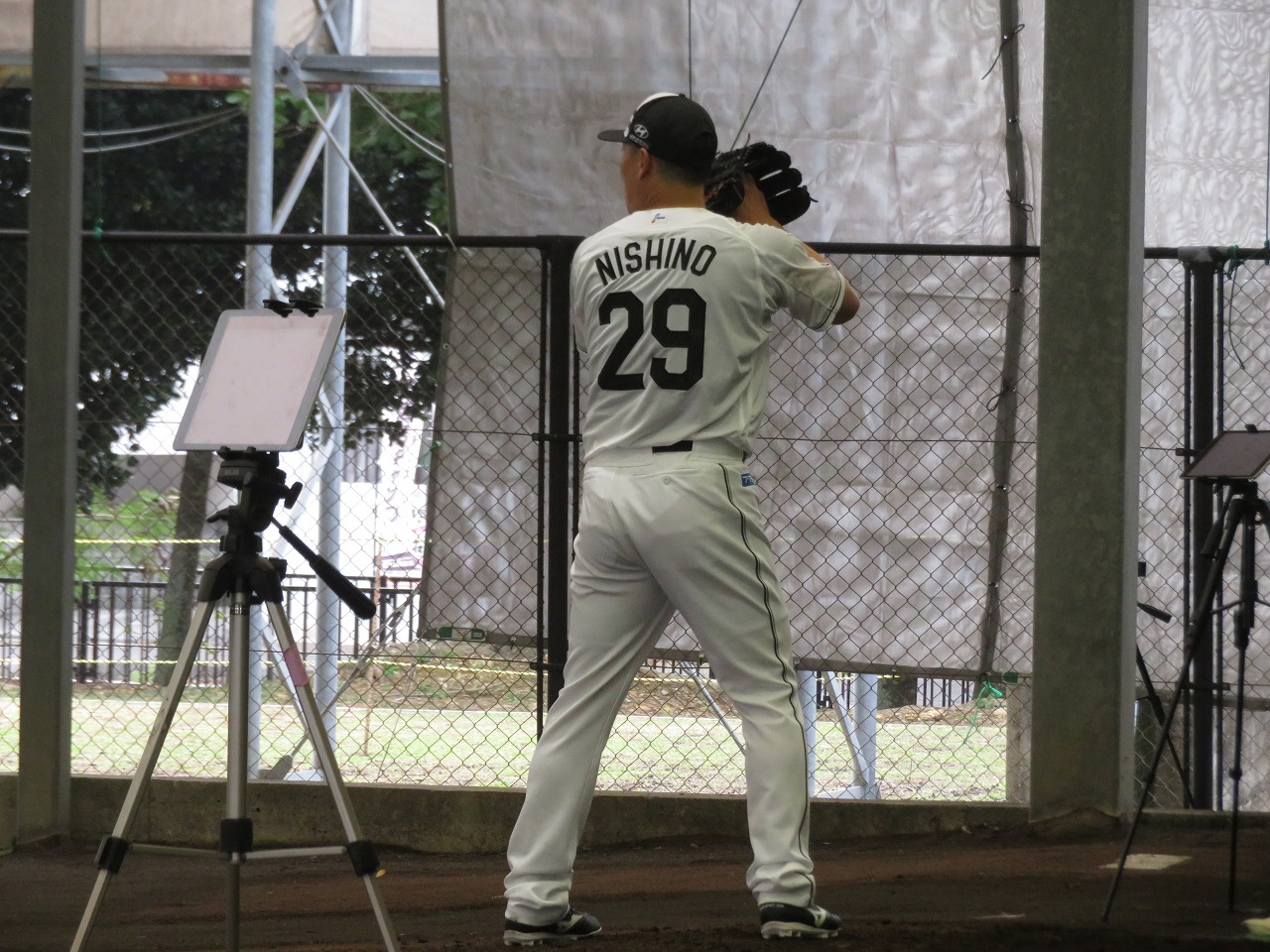 ブルペンで投球練習をする西野投手です。今年こそ10勝。期待しております。