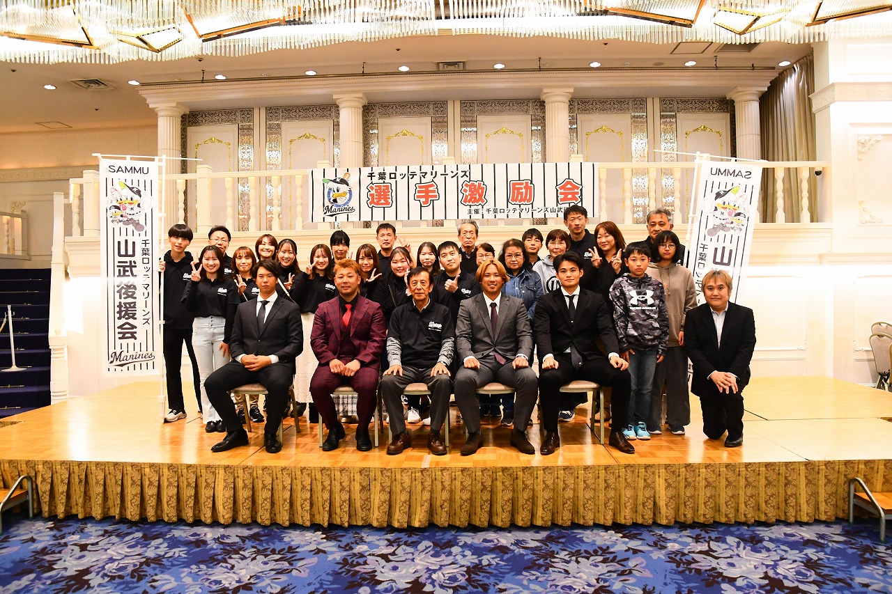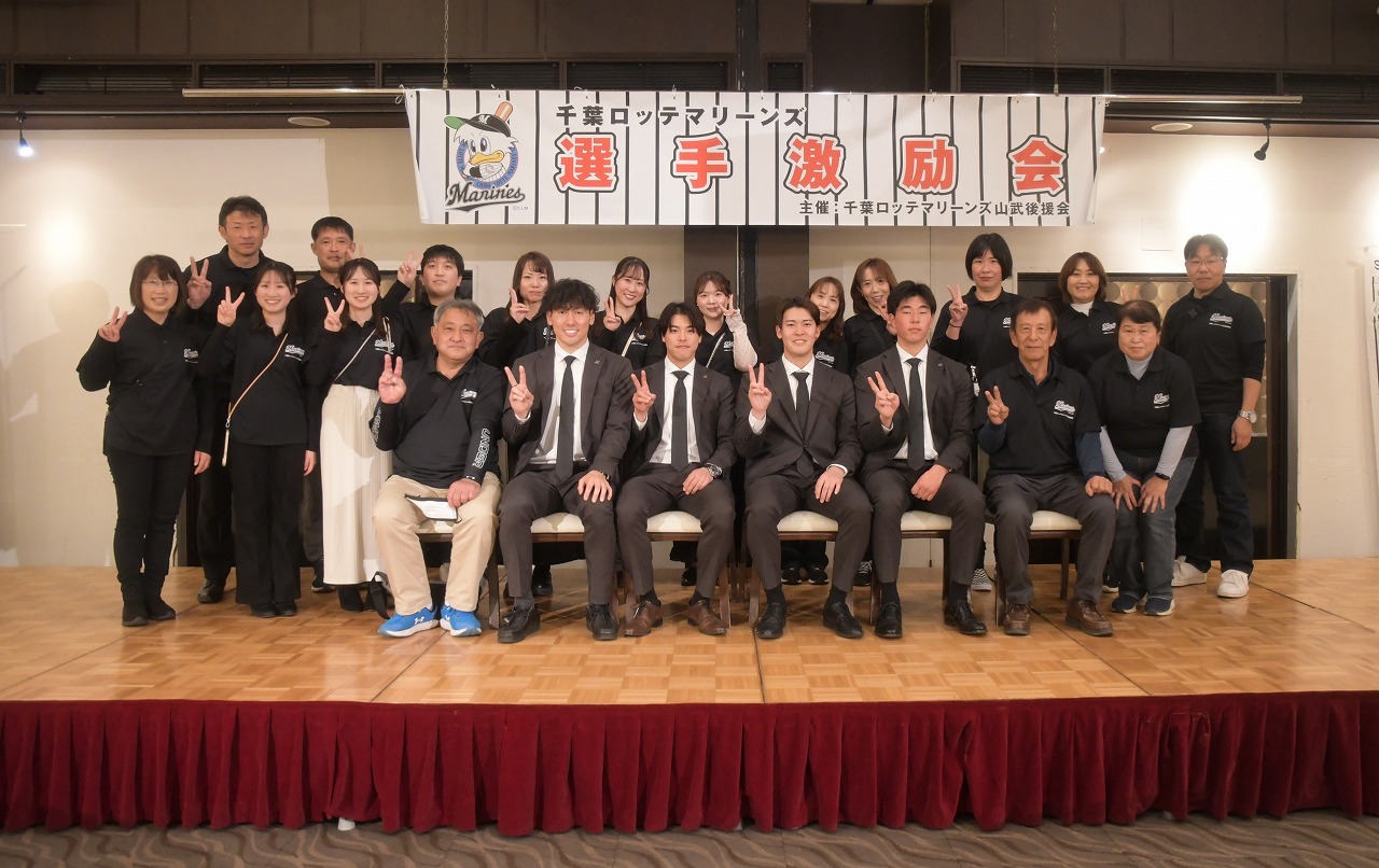 slider (1)slider (2)slider (3)slider (4)slider (5)slider (6)slider (7)slider (8)slider (9) 千葉ロッテマリーンズ山武後援会について 私達は、地元千葉にフランチャイズを置く、『千葉ロッテマリーンズ』を愛し、応援したいと思います。 そして、郷土愛が薄れていくなか、一致団結して『千葉ロッテマリーンズ』を応援する事で、 我が郷土、千葉並びに山武に対する、新たな一体感を共有すると共に、 将来のある青少年達の支援や、その他ボランティア活動を通じ、地元を意識し、強い関心を抱き、 そこに親しみと誇りと、希望の心と、感謝の心が芽生え育まれていくよう、啓蒙する事を目標として本会を設立するものであります。以上の設立趣旨にご賛同のうえ、多数の方々のご入会をお願い申し上げます。